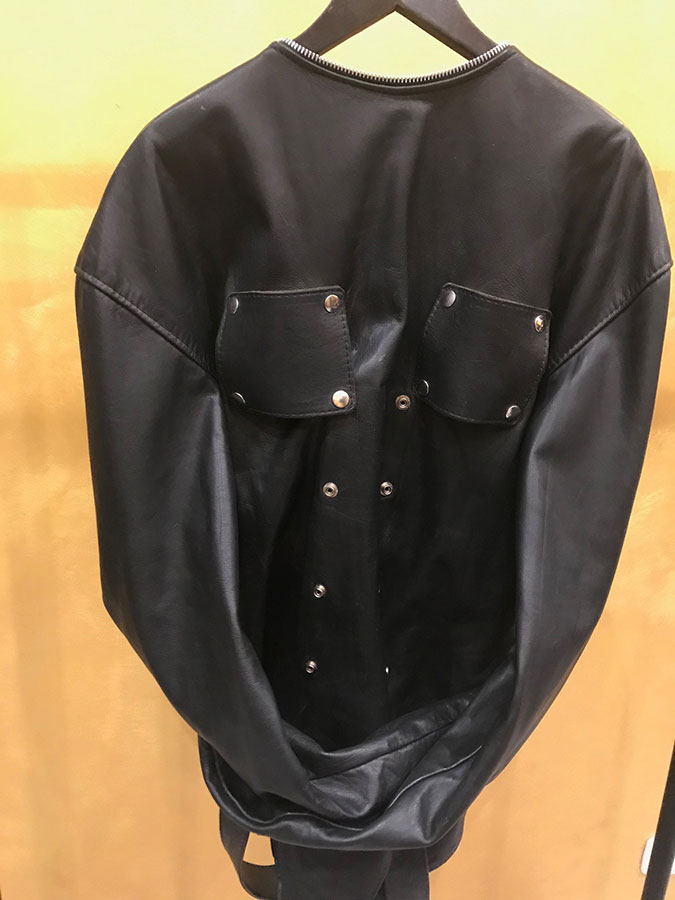 Unsere Reinigungskraft putzt und desinfiziert die Leder-Zwangsjacke nach jeder Benutzung mit einem professionellen Dampfgerät.